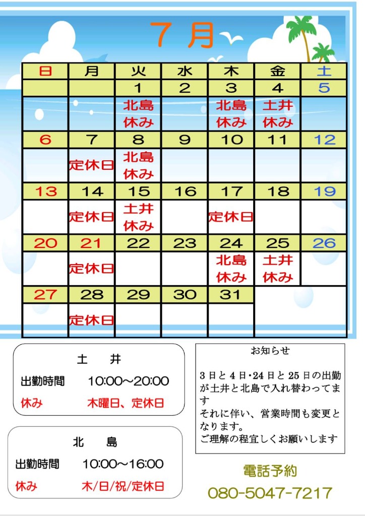 7月のシフトと営業時間についてお知らせいたします。