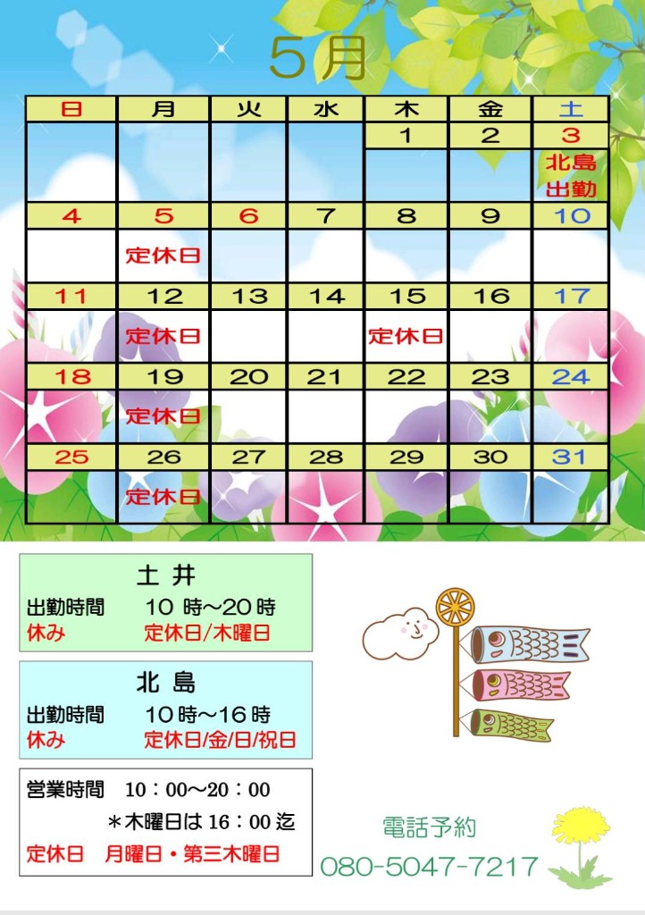 5月のシフトと営業時間についてお知らせいたします。