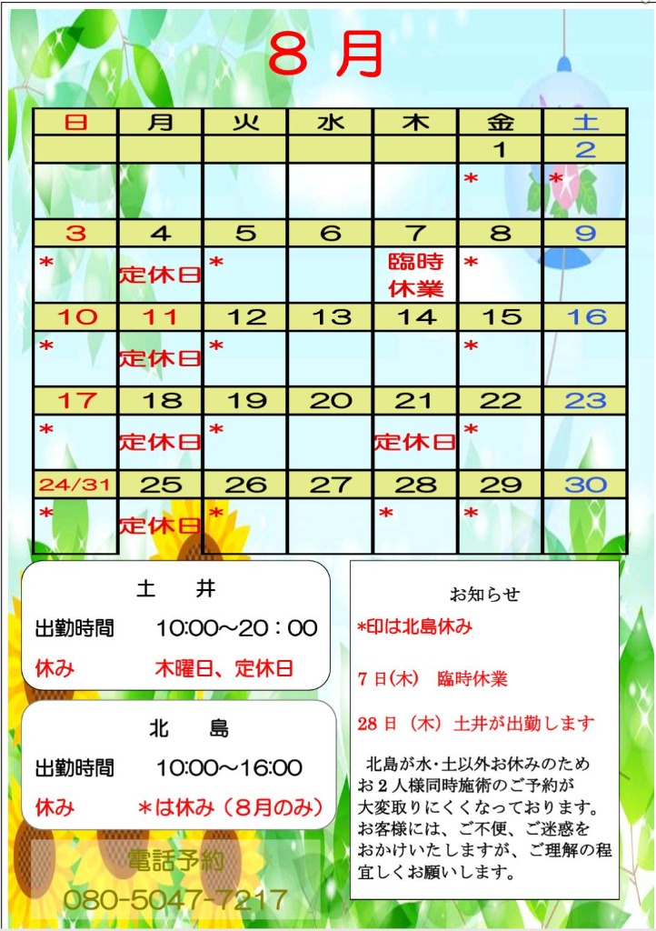 8月のシフトと営業時間についてお知らせいたします。