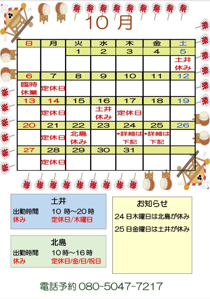 24日(木曜日)と25日(金曜日)は土井と北島の休みが入れ替わっております。