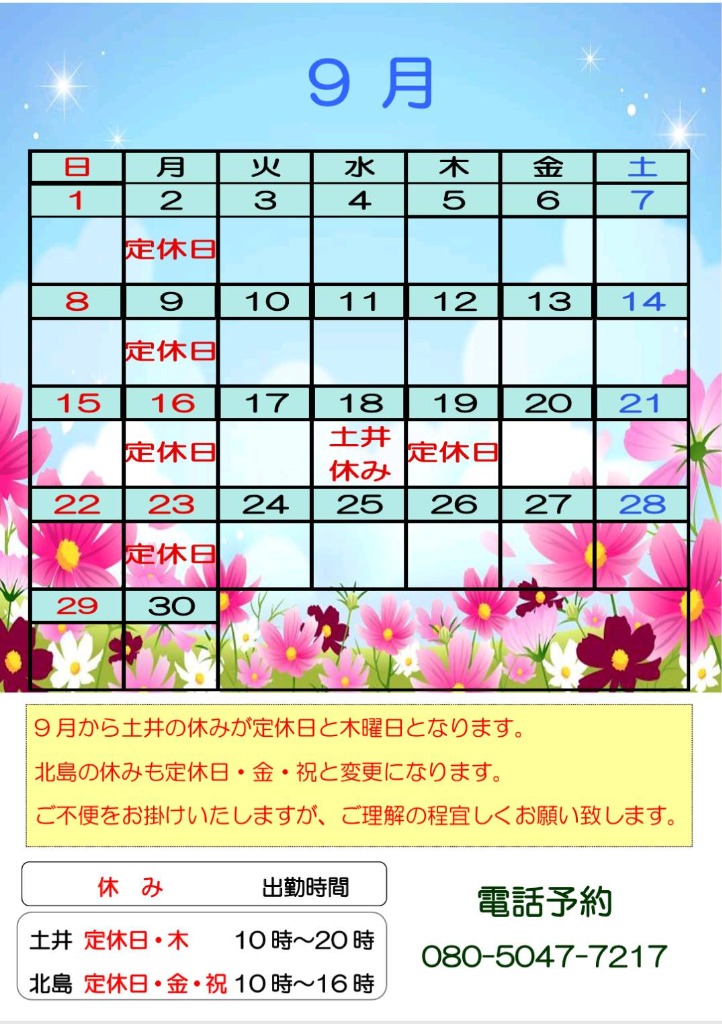 9月からスタッフの休みが変更となりますので、ご確認のうえご利用ください。